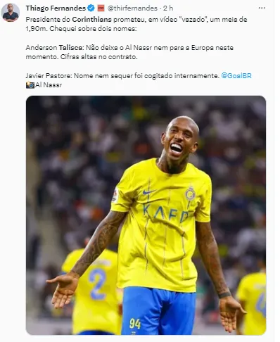 Nas redes sociais, nas últimas horas, o meia Anderson Talisca, de 30 anos, do Al-Nassr, da Arábia Saudita, virou nome muito repercutido entre os torcedores do Corinthians. O jogador teve seu nome muito pesquisado e comentado na Fiel.