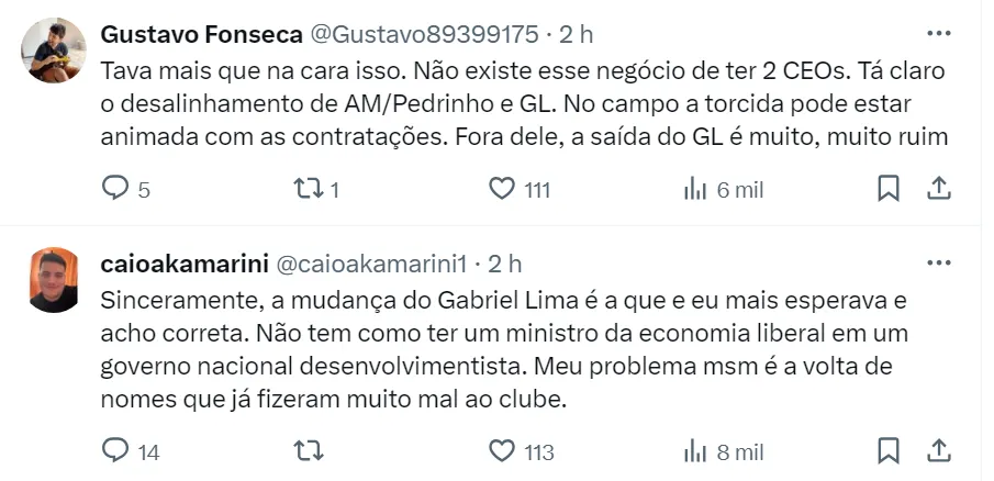 “Além da vontade de Gabriel Lima de sair, há também uma disposição dos atuais dirigentes de mudar o CEO do clube. A avaliação que o custo dele de R$ 150 mil por mês é muito alto”, explicou o jornalista em seu canal no Youtube.