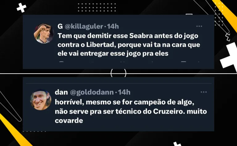 “O Cruzeiro abdica de jogar, aceita pressão e é covarde há vários jogos. Bateu no teto, ficou manjado e o Seabra não tem noção de como mudar isso. Jamais foi bem fora de casa, por exemplo. Inaceitável, pois, com mais repertório e coragem, há chance de ganhar a Sula e ficar no G6.”, criticou outro internauta.