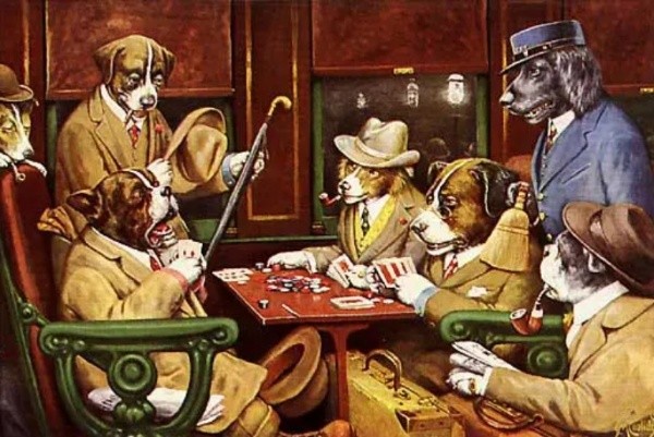 Se você está atento em tudo que circula no mundo do poker já deve ter visto a imagem de capa deste texto. Sete cachorros jogando poker em uma mesa redonda onde um deles passa uma carta para o outro. Este é um quadro de Cassius Coolidge, feito em 1894 e que já chegou a ser vendido por R$ 2 milhões. A obra é bastante conhecida e até mesmo foi motivo de piada em um episódio do desenho Os Simpsons.