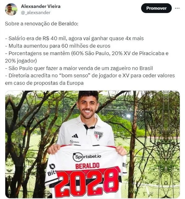Segundo apurou a reportagem, Beraldo tinha vencimentos na casa dos R$ 40 mil por mês, após uma renovação de contrato quando subiu para os profissionais. Do time titular, o jogador era o que tinha o menor valor e estava bem defasado em relação aos demais jogadores, mas agora, seus valores aumentaram em quase quatro vezes.