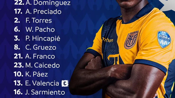 Os equatorianos vem com: A. Domínguez, Preciado, Félix Torres, Pacho e Hincapié; Gruezo, Alan Franco, Moisés Caicedo e Kendry Páez; Enner Valência (C) e Sarmiento