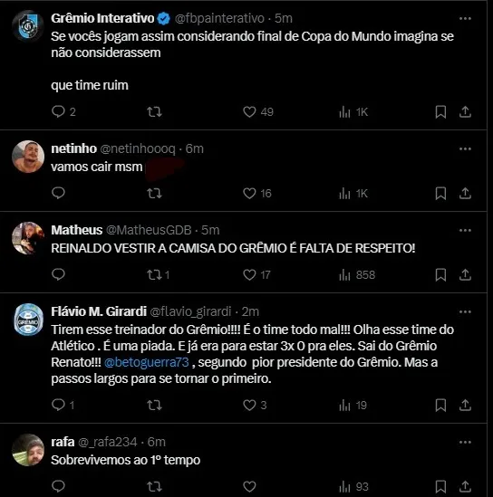 TORCIDA DO GRÊMIO REAGE AO PRIMEITO TEMPO NA WEB