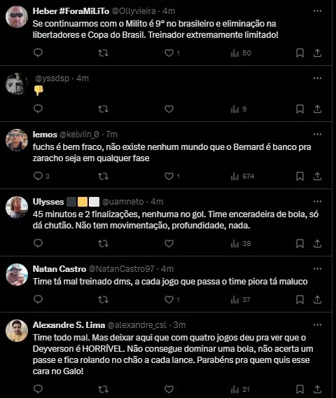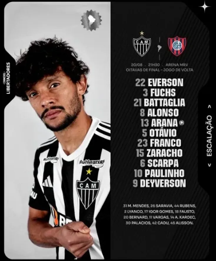 O Galo vem a campo com Everson, Fuchs, Battaglia, Alonso, Arana, Otávio, Franco, Zaracho, Scarpa, Paulinho e Deyverson, sob comando do técnico Gabriel Milito.
