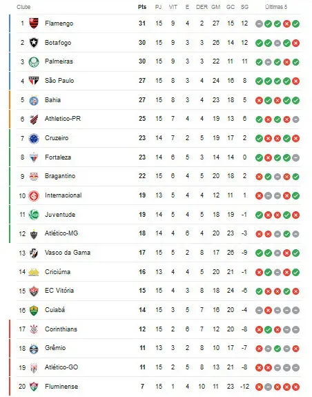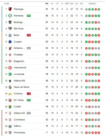 Nesse momento, com alguns jogos ainda em andamento, é assim que está a classificação do Brasileirão.