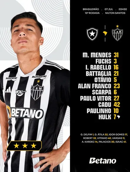 O Galo vem a campo com Matheus Mendes, Fuchs, Igor Rabello, Battaglia, Otávio, Alan Franco, Scarpa, Paulo Vitor, Cadu, Paulinho e Hulk, sob comando do técnico Gabriel Milito.