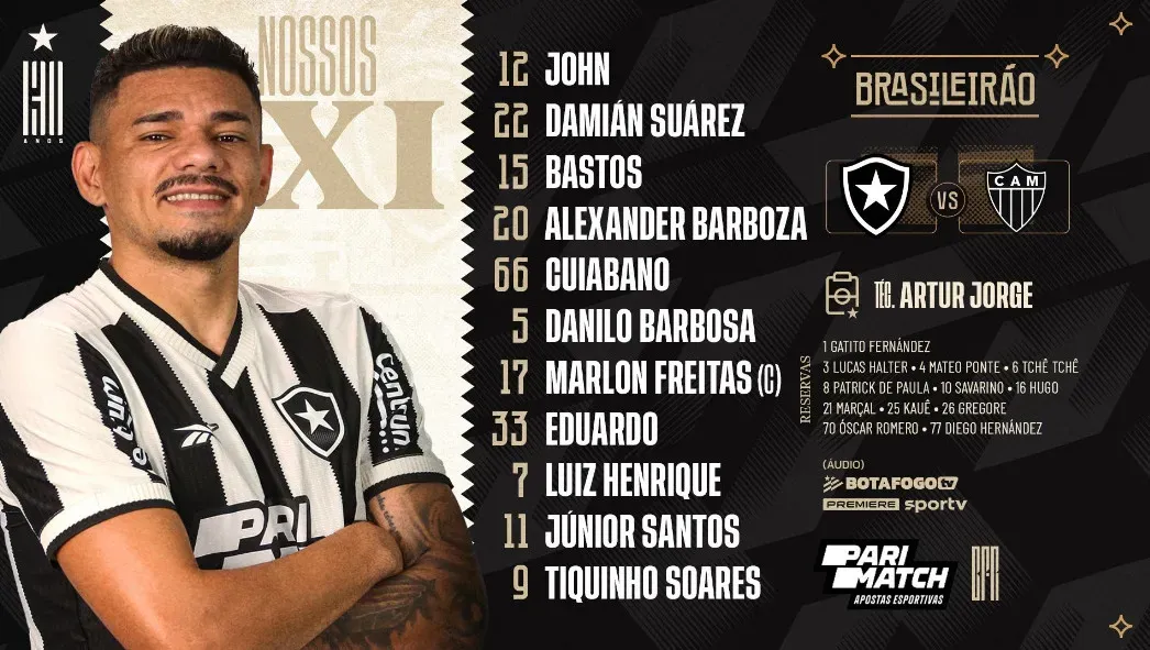 O Fogão vem a campo com John, Damián Suárez, Bastos, Alexander Barboza, Cuiabano, Danilo Barbosa, Marlon Freitas, Eduardo, Luiz Henrique, Júnior Santos e Tiquinho Soares, sob comando do técnico Artur Jorge.