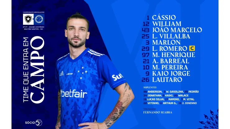 A Raposa também está definida pro duelo: Cássio, William, João Marcelo, L.Villalba e Marlon; L. Romero (C), M. Henrique, A. Barreal e M. Pereira; Kaio Jorge e Lautaro.