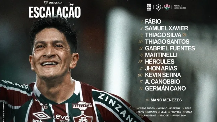 O Tricolor das Laranjeiras comandado por Mano Menezes começa o duelo com Fábio, Samuel Xavier, Thiago Silva, Thiago Santos, Gabriel Fuentes, Martinelli, Hércules, Jhon Arias, Kevin Serna, Canobbio e Germán Cano.