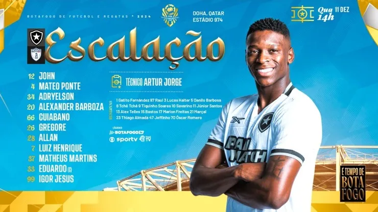 O Fogão vai a campo com John, Mateo Ponte, Adryelson, Alexander Barboza, Cuiabano, Gregore, Allan, Luiz Henrique, Matheus Martins, Eduardo e Igor Jesus, sob comando do técnico Artur Jorge.