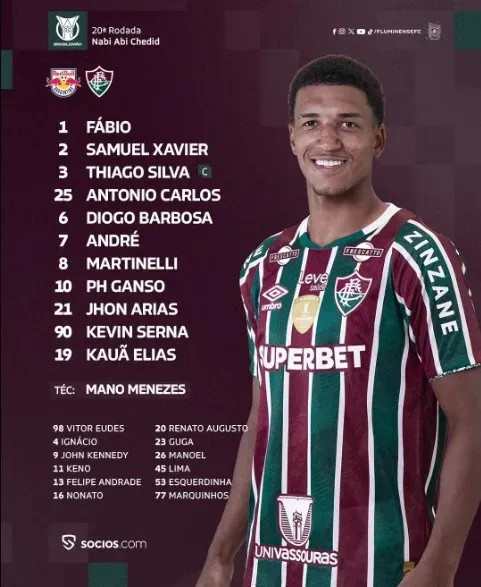 O Fluminense começa o jogo com Fábio, Samuel Xavier, Thiago Silva, Antonio Carlos, Diogo Barbosa, André, Martinelli, PH Ganso, Jhon Arias, Kevin Serna e Kauã Elias, sob comando do técnico Mano Menezes.