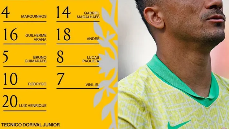 Dorival Júnior manda o Brasil a campo com: Alisson; Danilo, Marquinhos, Gabriel Magalhães, Arana; André, Bruno Guimarães, Lucas Paquetá; Vini Jr., Luiz Henrique e Rodrygo.