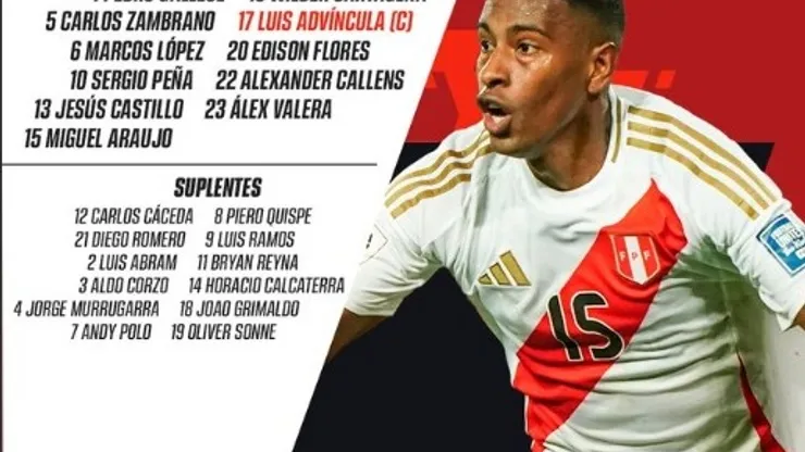A Seleção Peruana começa o duelo com Gallese, Araujo, Zambrano, Callens, Advíncula, Castillo, Cartagena, Peña, López, Valera e Flores, sob comando do técnico Jorge Fossati.