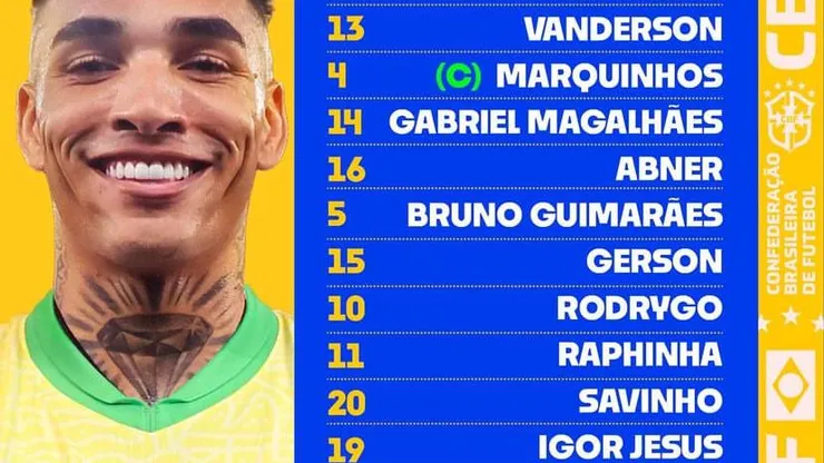 A Seleção Brasileira vem a campo com Ederson, Vanderson, Marquinhos, Gabriel Magalhães, Abner, Bruno Guimarães, Gerson, Rodrygo, Raphinha, Savinho e Igor Jesus, sob comando do técnico Dorival Junior.
