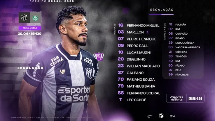 O Vozão começa o jogo com Fernando Miguel, Marllon, Pedro Henrique, Pedro Raul, Lucas Mugni, Dieguinho, Willian Machado, Galeano, Fabiano Souza, Matheus Bahia e Fernando Sobral, sob comando do treinador Léo Condé.