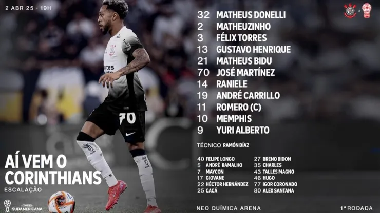 O Timão vem a campo com Matheus Donelli, Matheuzinho, Félix Torres, Gustavo Henrique, Matheus Bidu, José Martínez, Raniele, André Carrillo, Romero, Memphis Depay e Yuri Alberto, sob comando do técnico Ramón Díaz.