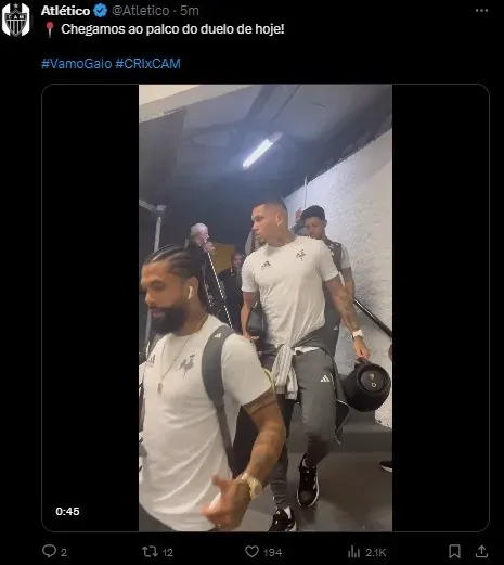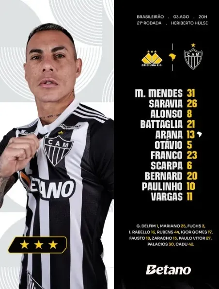 O Galo começa a partida com Matheus Mendes, Saravia, Alonso, Battaglia, Guilherme Arana, Otávio, Franco, Scarpa, Bernard, Paulinho e Vargas, sob comando do técnico Gabriel Milito.