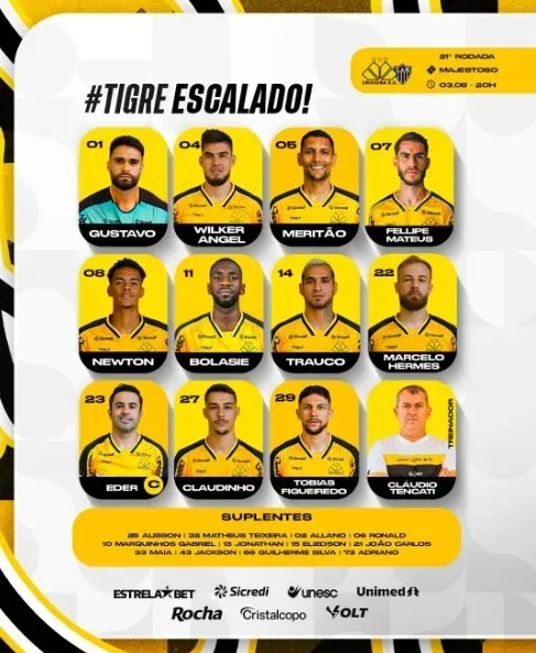 O Trigre vem a campo com Gustavo, Wilker Angel, Meritão, Felipe Mateus, Newton, Bolasie, Trauco, Marcelo Hermes, Eder, Claudinho e Tobias Figueiredo, sob comando do técnico Cláudio Tencati.