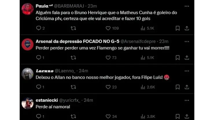 A torcida rubro-negra quer que o Mengão entregue a partida para o Criciúma, pois o Tigre é um adversário direto contra o rival Fluminense na briga para se manter na Série A.