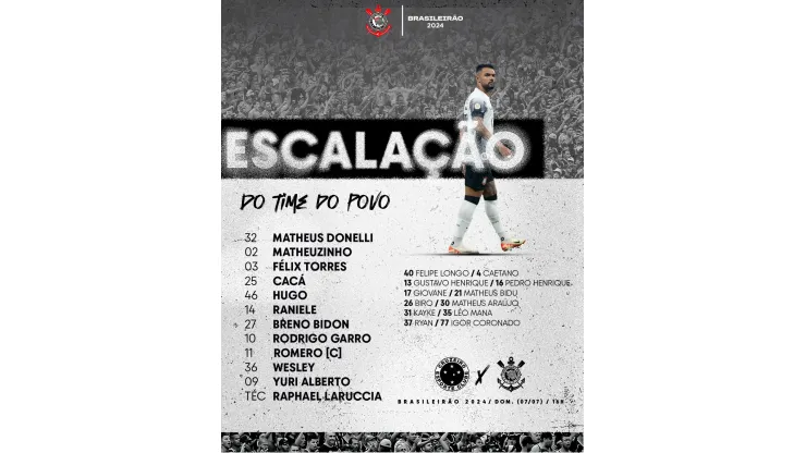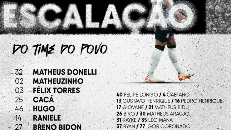 O Timão vem com: Matheus Donelli, Matheuzinho, Félix Torres, Cacá e Hugo; Raniele, Breno Bidon e Rodrigo Garro; Romero (C), Wesley e Yuri Alberto.