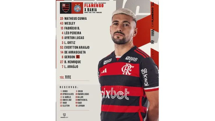 Matheus Cunha, Wesley, Fabrício Bruno, Léo Pereira, Ayrton Lucas, Léo Ortiz, Evvertton Araújo, De Arrascaeta, Gerson, Bruno Henrique e Luiz Araújo