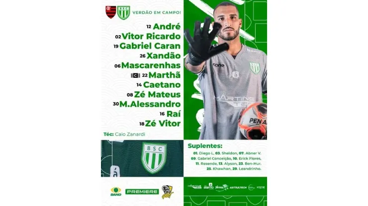 O Verdão de Saquarema começa o jogo com: André, Vitor Ricardo, Gabriel Caran, Xandão, Mascarenhas, Marthã, Caetano, Zé Mateus, Matheus Alessandro, Raí e Zé Vitor, escalados pelo treinador Caio Zanardi.