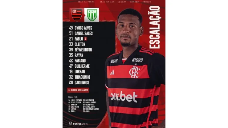 O Mengão vai a campo com: Dyogo Alves, Daniel Sales, Pablo, Cleiton, Zé Welinton, Rayan, Fabiano, Guilherme, Lorran, Thiaguinho e Carlinhos, sob comando do técnico Cléber dos Santos.