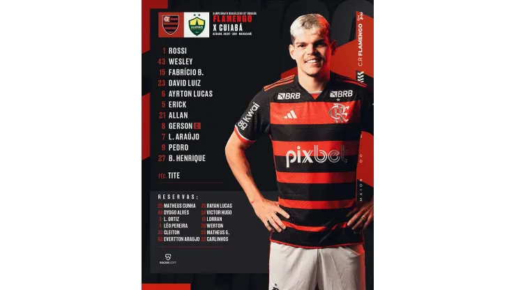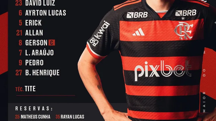 O Rubro-Negro vem a campo com: Rossi, Wesley, Fabrício Bruno, David Luiz e Ayrton Lucas; Erick Pulgar, Allan e Gerson (C); Luiz Araújo, Pedro e Bruno Henrique