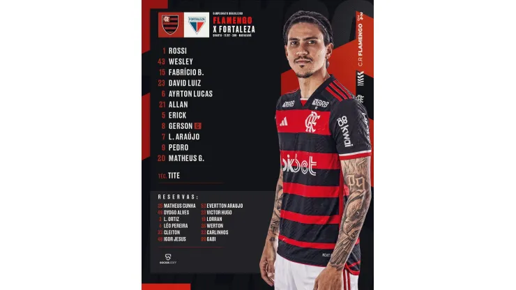 O técnico Tite escala o Flamengo para a partida de hoje com: Rossi; Wesley, Fabrício Bruno, David Luiz e Ayrton Lucas; Allan, Erick Pulgar e Gerson; Luiz Araújo, Matheus Gonçalves e Pedro.