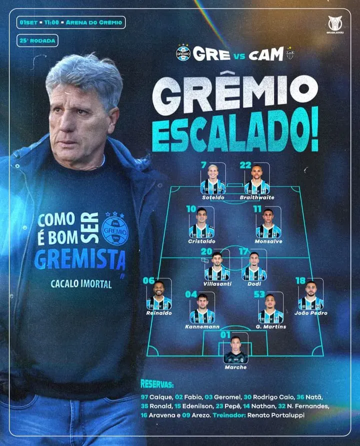 O Imortal vem a campo com Marchesín, João Pedro, Gustavo Martins, Kannemann, Reinaldo, Dodi, Villasanti, Monsalve, Cristaldo, Braithwaite e Soteldo, sob comando do técnico Renato Portaluppi.