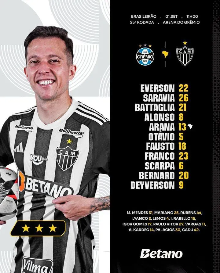 O Galo começa o jogo com Everson, Saravia, Battaglia, Alonso, Guilherme Arana, Otávio, Fausto Vera, Alan Franco, Gustavo Scarpa, Bernard e Deyverson, sob comando do técnico Gabriel Milito.