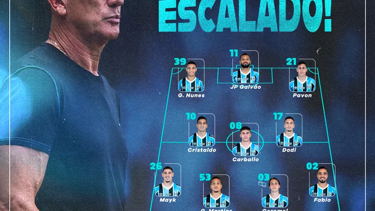 97 Caíque 02 Fabio 03 Geromel (capitão) 53 Gustavo Martins 26 MAyk 17 Dodi 08 Carballo 10 Cristaldo 21 Pavon 39 Gustavo Nunes 11 JP Galvão