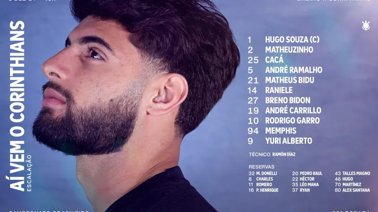 O Corinthians entrará em campo com: Hugo; Matheuzinho, Cacá, André Ramalho, Bidu; Raniele, Bidon, Carrillo, Garro; Yuri Alberto e Memphis