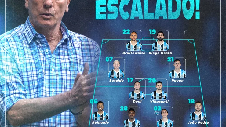 O Imortal vem com: Caíque; João Pedro, Geromel (capitão), Jemerson, Reinaldo, Villasanti, Dodi, Pavon, Soteldo, Diego Costa, Braithwaite
