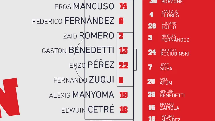 Os argentinos vão a campo com: Matías Mansilla, Eros Mancuso, Federico Fernández e Zaid Romero; Gastón Benedetti, Enzo Pérez, Fernando Zuqui, Alexis Monyoma e Edwuin Cetré; Pablo Piatti e Javier Correa