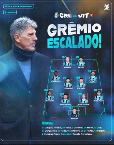 Neste domingo (21), Grêmio e Vitória se enfrentaram pela décima oitava rodada do Campeonato Brasileiro no Estádio Centenário, em Caxias do Sul, às 11h (horário de Brasília).