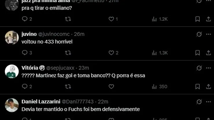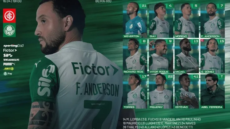 O Verdão começa o jogo com Weverton, Giay, Piquerez, Micael, Gustavo Gómez, Aníbal Moreno, Richard Ríos, Felipe Anderson, Facundo Torres, Estêvão e Vitor Roque, sob comando do técnico Abel Ferreira.