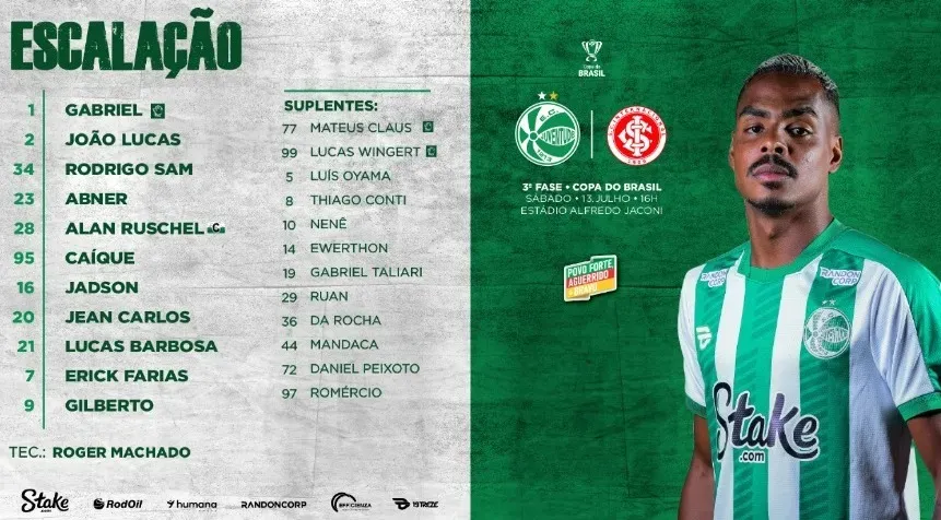 O Juventude vem a campo com Gabriel, João Lucas, Rodrigo Sam, Abner, Alan Ruschel, Caíque, Jadson, Jean Carlos, Lucas Barbosa, Erick Farias e Gilberto, sob comando do técnico Roger Machado.