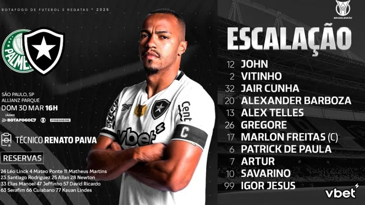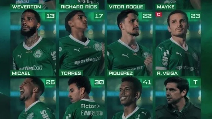 O Verdão vem a campo com Weverton, Murilo, Micael, Piquerez, Mayke, Lucas Evangelista, Richard Ríos, Raphael Veiga, Facundo Torres, Estêvão e Vitor Reis, sob comando do técnico Abel Ferreira.