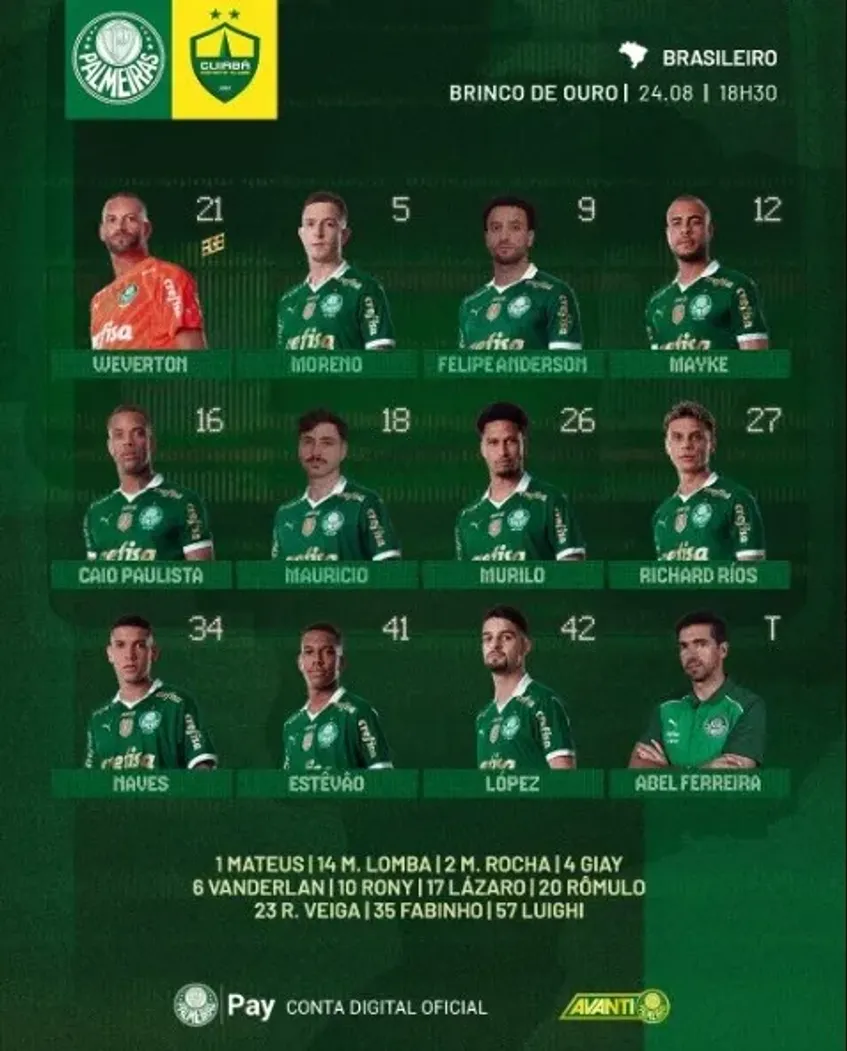 O Verdão vem a campo com Weverton, Moreno, Felipe Anderson, Mayke, Caio Paulista, Maurício, Murilo, Richard Ríos, Naves, Estêvão e Flaco López, sob comando do técnico Abel Ferreira.