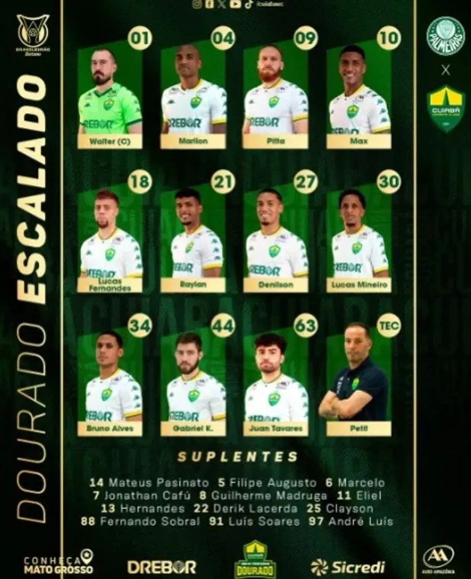 O Dourado começa o jogo com Walter, Marllon, Isidro Pitta, Max, Lucas Fernandes, Railan, Denílson, Lucas Mineiro, Bruno Alves, Gabriel Knesowitsch e Juan Tavares, sob comando do técnico Petit.