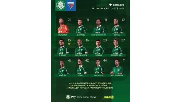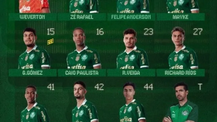 O Verdão vem a campo com Weverton, Zé Rafael, Felipe Anderson, Mayke, Gustavo Gómez, Caio Paulista, Raphael Veiga, Richard Ríos, Estêvão, Flaco López e Vitor Reis, com Abel Ferreira no comando.