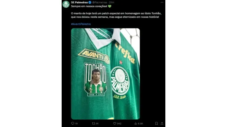 O Verdão usará seu uniforme 1, com um patch em homenagem ao ídolo Tonhão, que nos deixou nesta semana.
