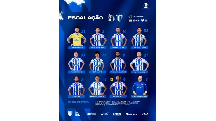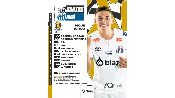 O Peixe de Fábio Carille vai a campo com: Gabriel Brazão, Rodrigo Ferreira, Gil, Jair e Escobar; João Schmidt, Diego Pituca e Serginho; Otero, Guilherme e J. Furch.