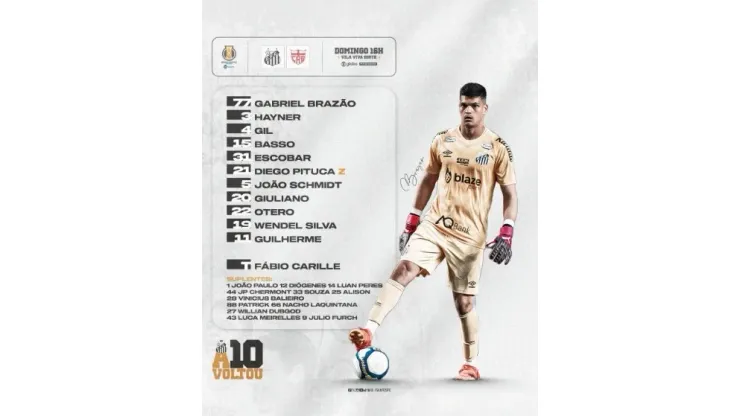 O Santos entra em campo hoje após se tornar campeão do Brasileirão Série B ontem (16). Isso foi possível após o concorrente ao título Novorizontino empatar com o Paysandu, não conseguindo os pontos suficientes para ultrapassar o Peixe na última rodada da competição.