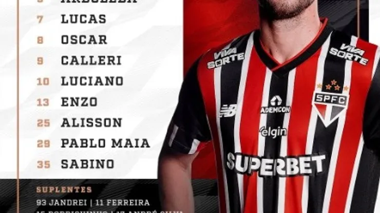 O Tricolor Paulista começa o clássico com Rafael, Igor Vinícius, Arboleda, Lucas Moura, Oscar, Calleri, Luciano, Enzo, Alisson, Pablo Maia e Sabino, sob comando do treinador Luis Zubeldía.