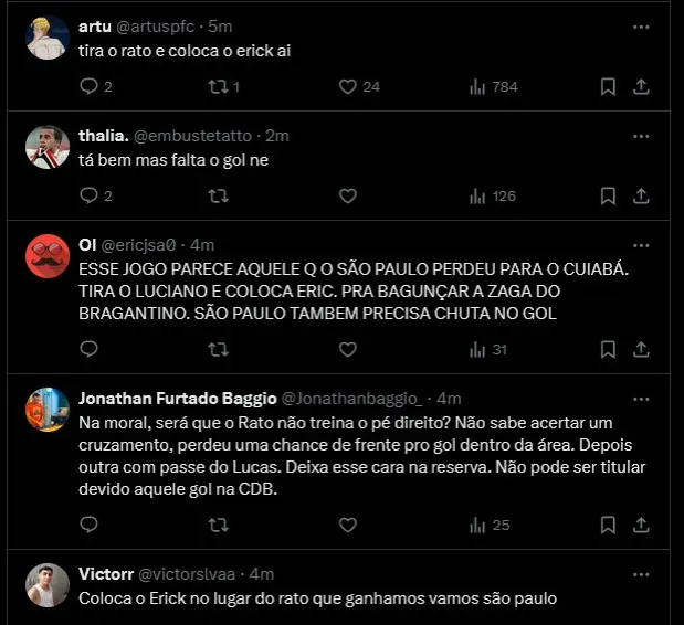 O jogo é bem equilibrado até aqui. O Bragantino teve uma chance clara de gol no chute de Sasha e ótima defesa do Jandrei. O São Paulo teve oportunidade com Rato dentro da área tentando encobrir o goleiro mas exagerando na força do chute. Segue 0 a 0 no MorumBis.