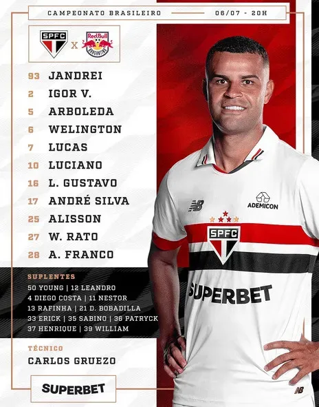 O Tricolor vem a campo com Jandrei, Igor Vinícius, Arboleda, Wellington, Lucas, Luciano, Luiz Gustavo, André Silva, Alisson, Wellington Rato e Alan Franco, sob o comando de Carlos Gruezo, visto que o técnico Luis Zubeldía está cumprindo suspensão.