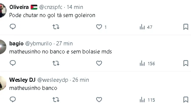 O São Paulo conta com os seguintes jogadores no banco de reservas: Young, Diego Costa, Galoppo, Michel Araújo, André Silva, Wellington Rato, Juan, Erick, Igão, Sabino, Patryck e William