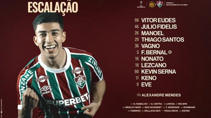 O Tricolor das Laranjeiras vem a campo com Vitor Eudes, Julio Fidelis, Manoel, Thiago Santos, Vagno, Facundo Bernal, Nonato, Lezcano, Kevin Serna, Keno e Eve, sob comando do técnico auxiliar Alexandre Mendes.